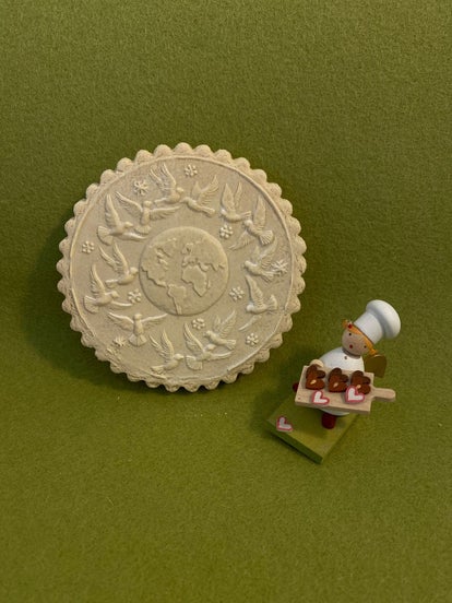 Weltfrieden. Das Motiv auf diesem Springerle verdeutlicht, wie wichtig Zusammenhalt ist. Die ausgebreiteten Flügel der die Welt beschützenden Tauben zeigen uns, dass Frieden immer die Anstrengung des Einzelnen und aller verlangt.
